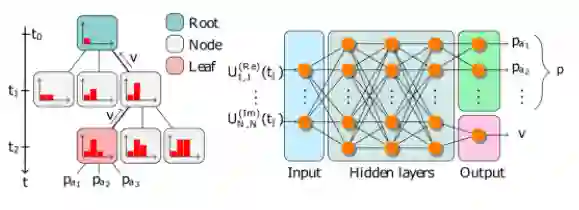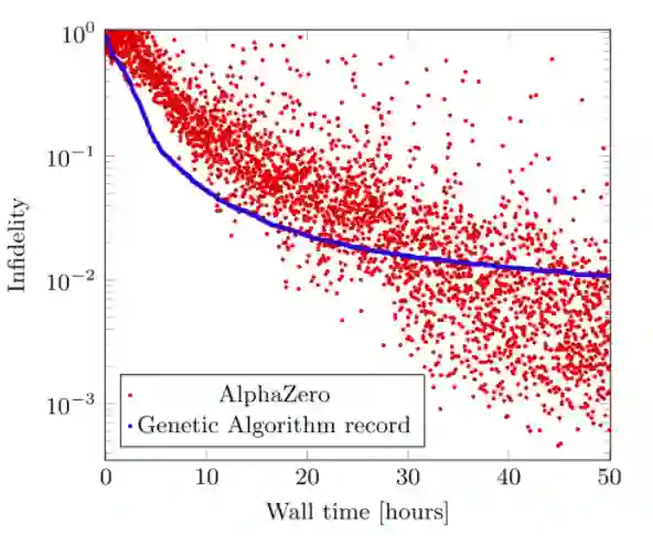 AlphaZero一开始是专门用来下围棋的。围棋的落子位置太多了大约有种。相比之下,国际象棋只有种可能的走位。 所以AlphaZero使用了一个深层的神经网络,它学会了从一个特定的位置开始评估它获胜的可能性。为了获胜,AlphaZero有一个功能叫做蒙特卡洛树搜索,这种方法能够帮助它在游戏中“预知未来”。由于在所有可能策略中抽样的可能性比较小,而且神经网络只能近似估计,所以特别是在其训练阶段,蒙特卡洛树搜索能够极大地提高游戏的准确性以及训练效率。这类似于职业棋手在下棋时能够提前想几步棋。训练结果是相当惊人的,AlphaZero 很快就摧毁了专业游戏软件和人类玩家。例如,经过仅仅四个小时的自我对弈练习,AlphaZero 就在国际象棋中击败了领先的棋类软件 Stockfish。而且这完全都是从零开始,一开始AlphaZero根本不知道游戏规则。丹麦国际象棋大师Peter Heine Nielsen将其比作一个访问过地球的高级外星物种。目前AlphaZero 已经有效地在围棋,国际象棋和星际争霸中战胜对手。AlphaZero成功的关键是将蒙特卡罗树搜索和具有前瞻性的深度神经网络结合起来。结果表明,从树下方延展出来的预测信息极大地提高了深度神经网络的精度,使预测结果更加准确集中,而非试探性的探索。AlphaZero后发制人:30小时性能提高一个数量级与普通计算机类似,量子计算机使用门操作(gate operations)来操纵其量子位。我们试图通过构建分段恒定的脉冲序列来实现特定的门操作,即AlphaZero必须为每个时间步长(time-step)选择一个脉冲幅度。物理系统在每个时间步长tj上都由一个4x4复杂的矩阵U(tj)进行数学描述,我们将其折叠成一个长度为32的向量。这是神经网络的输入,如图1所示。脉冲序列完成后,就可以将复数矩阵U(T)映射为一个实数,称为仿真逼真度(fidelity)F,该实数的取值在0到1之间。从本质上讲,仿真逼真度是一种概率度量,其中1表示100%成功。图1.AlphaZero使用的MCTS(左)和深度神经网络(右)的图示左图和右图分别演示了 AlphaZero 的树搜索和神经网络。利用树搜索中统一的搜索结果作为神经网络的输入项。神经网络的上限输出接近给定输入状态的现行策略,即 p a ∼ a pa ∼ a。同时,下限输出提供了一个能够预估期望最终报酬的值函数,即 v (s t)∼(t) v (st)∼ f (t)。在我们的工作中,我们发现以一致的形式向 AlphaZero 提供物理系统的完整信息,有利于提升它的性能,尽管这种方式可能比较难以调整以适应具有较大希尔伯特空间的系统。神经网络输出一个值,该值是对最终仿真逼真度v≈F和一些移动概率p=(p1, p2, ...)的估计。两者都在蒙特卡洛树搜索中使用。树由节点(状态)和边(状态-动作对)组成。树搜索从根节点开始,并通过在每个步骤中选择动作来贯穿树。选择哪种行动,是通过比较每一个边缘的内在属性,以平衡勘探和开发的方式进行的。一旦探索到了边缘,其内在属性将根据搜索结果进行更新。树中的正向搜索将继续,直到遇到一个以前未访问过的节点,然后将该节点添加到树中,并使用p初始化其边缘。搜索中的所有访问过的边都将使用v在反向过程中更新。一旦执行了多次此类搜索,AlphaZero将确定一个操作并更新根节点,而丢弃树的其余部分。最后,基于树搜索产生的数据对神经网络进行更新,使得v接近保真度,并且移动概率增加了选择更有希望动作的机会。简言之:蒙特卡洛树搜索允许AlphaZero向前看几步,从而可以在解决方案空间中进行更全面的搜索。这使得AlphaZero在长期策略至关重要的复杂任务中比大多数其他强化学习方法更具优势。成功实现AlphaZero之后,我们使用相同的算法超参数将其用于三个不同的量子控制问题。对于每个问题,我们将AlphaZero与更常规的算法进行了比较。例如,在图2中,我们比较了AlphaZero和遗传算法在50小时运行期间创建二进制脉冲的任务。在y轴上,我们绘制infidelity 1-F,这实际上是错误率(即越低越好)。最初,AlphaZero在学习量子力学关联时表现不如遗传算法,但是这个学习阶段相当短。在30小时内,我们发现AlphaZero的性能比遗传算法提高了一个数量级,并且具有大量独特的高保真脉冲序列。图2.遗传算法和AlphaZero在50小时运行期间的比较。在y轴上绘制了infidelity (1-F),这实际上是一个错误率 混合了AlphaZero的量子计算,搜索速度提升500倍AlphaZero会输给物理学家在过去15年不断完善的高度量子化的优化算法并不奇怪。但是,如果AlphaZero死在这里,会留下很多遗憾。由于梯度优化算法没有学习功能,意味着训练过程中其性能没有逐步提高,并且所有生成的数据都将被丢弃,而不是用于后续学习。奥胡斯大学的团队开始寻求一种混合算法:AlphaZero通过广泛的探索生成了高可用的种子对象,随后通过基于梯度的方法对它们进行优化,这种方法使解决方案的数量和质量都得到了极大的提高。实际上,AlphaZero和梯度优化解决了不同的问题:AlphaZero能学习到解决方案的基础结构,梯度优化在种子解决方案周围的局部空间中进行优化。如果仅使用梯度优化,经过50小时的模拟,我们可能有两个或三个有前途的解决方案,但通过我们的混合算法,可以获得一千个。将功能强大的通用领域机器学习方法与人类专业知识、特定领域的蛮力计算相结合的结果令人振奋。国际象棋已经迈出了第一步,混合型人机团队将专家知识和Stockfish引擎结合起来,可以同时胜过人类和算法。最近Gary Marcus和E