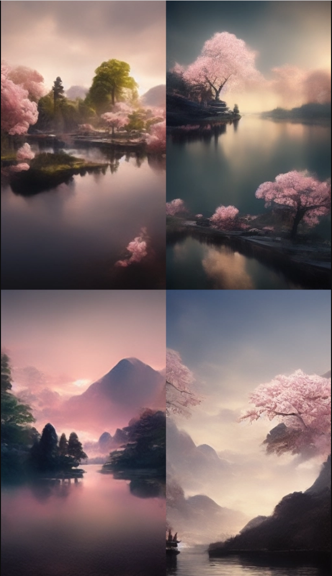 记者将表格中的“古风湖畔”关键词——“A ultra-realistic CG rendering of Ancient Japan,lake,serene landscape, cherry blossom forest,by Ivan Aivazovsky,in volumetric lighting, Trending on artstation --ar 9:16 ”输入Midjourney后,得到了这样四张图片: