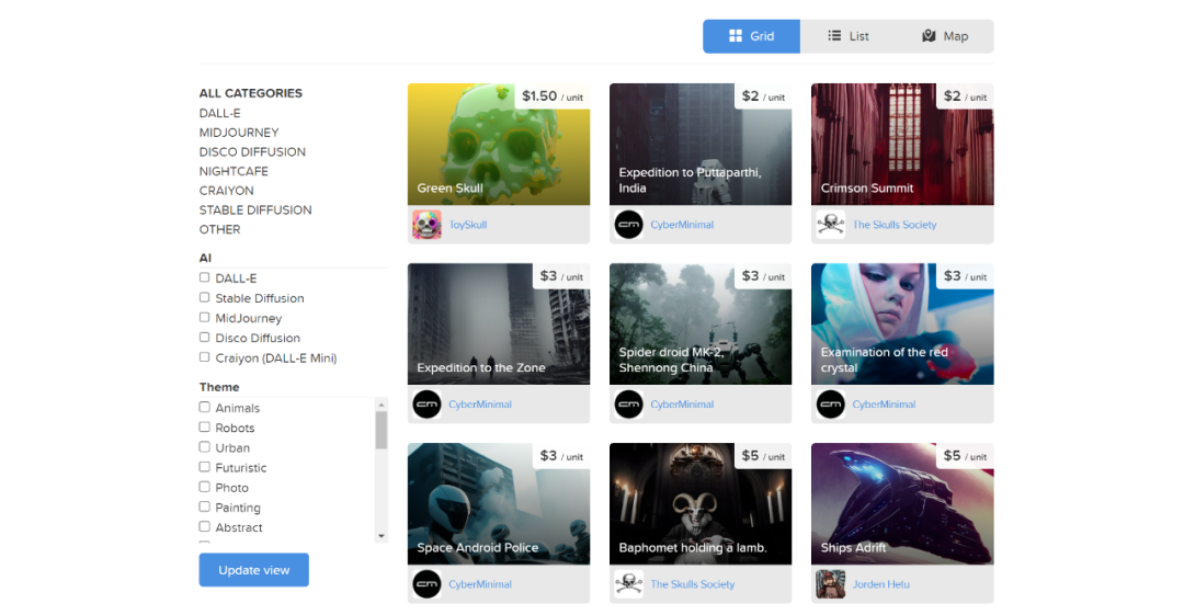 同样的网站还有NeutronField。这一网站由资深产品设计师Miroslav Kostić设立,销售适用于DALL-E、Stable Diffusion、MidJourney、Disco Diffusion、Craiyon (DALL-E Mini)等工具在内的提示词,提示词的价格在1-10美金不等。主题和风格从动物、机器人到摄影、3D渲染均有涉及,在经历了几个月的内测后,于2022年8月2日开始正式运营。