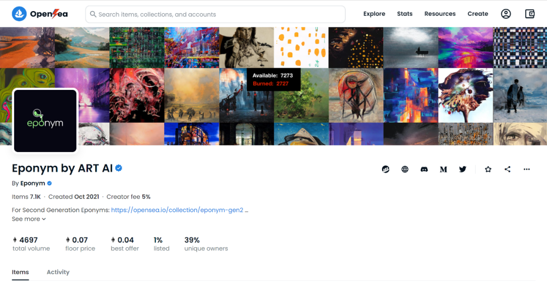 Eponym是Art AI开发的一个可以根据单词或短语生成艺术作品的AI算法,可以在一分钟之内生成抽象的艺术作品,铸成NFT,并将其刻在以太坊上。