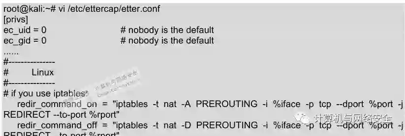 (2)使用VIM编辑etter.conf配置文件。将该文件中ec_uid和ec_gid配置项值修改为0,并将Linux部分附近IPTABLES行的注释去掉。修改结果如下所示: