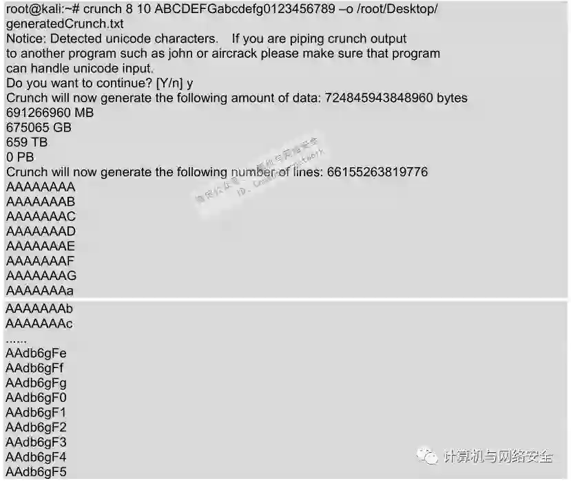 从以上输出的信息中,可以看到将生成659TB大的文件,总共有66155263819776行。以上命令执行完成后,将在桌面上生成一个名为 generatedCrunch.txt 的字典文件。由于组合生成的密码较多,所以需要很长的时间。