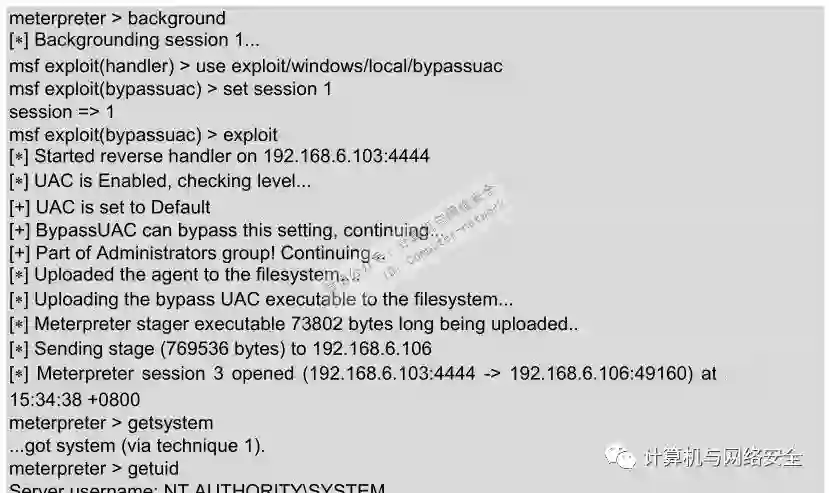 从输出的信息中,可以看到该用户的权限是一个普通权限。接下来,使用 bypassuac模块绕过UAC。