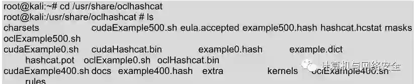 使用OclHashcat工具之前,一定要确定当前系统已正确安装了NVIDIA显卡驱动。在Kali 中,OclHashcat 默认安装在/usr/share/oclhashcat 目录中。所以需要先切换目录到OclHashcat,再启动OclHashcat工具。执行命令如下所示: