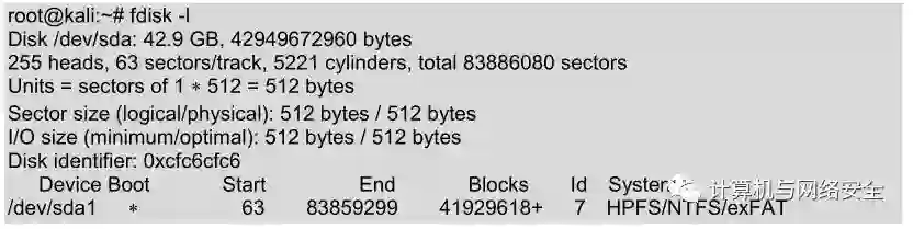 输出的信息表示当前系统中有一块磁盘,并只有一个分区。该文件系统类型是NTFS,也是Windows系统的所存放的磁盘。