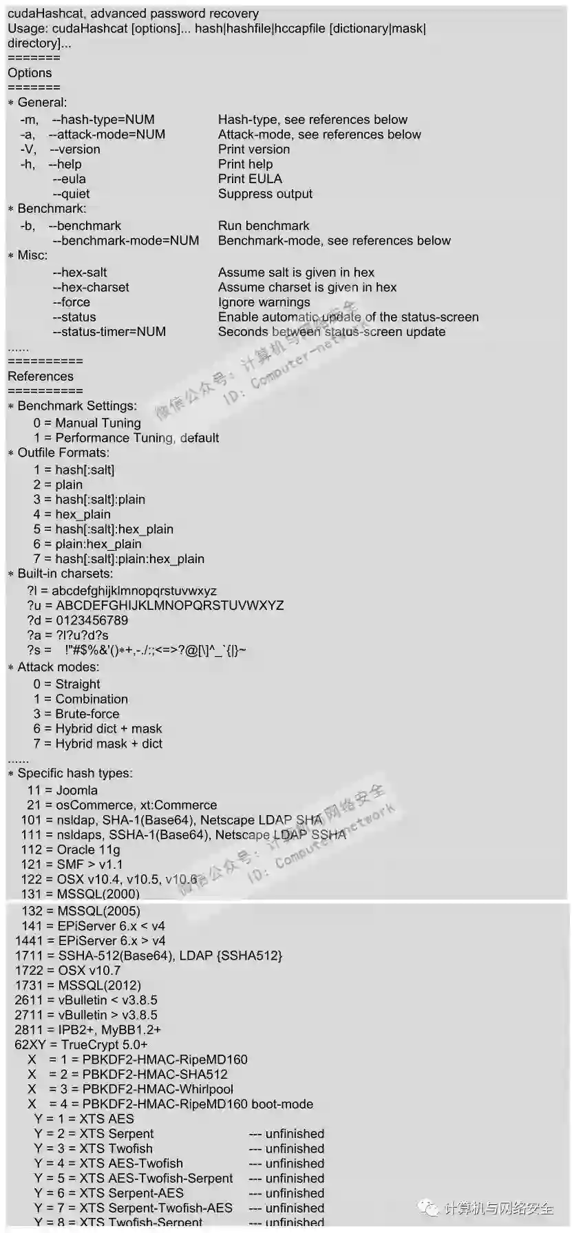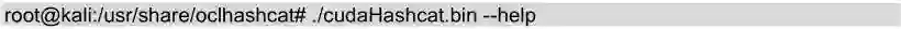 输出的信息显示了cudaHashcat.bin命令的语法格式、可用选项及配置例子等。