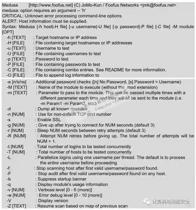 或者在桌面上依次选择“应用程序”—Kali Linux—“密码攻击”—“在线攻击”—medusa命令,将输出如下所示的信息: