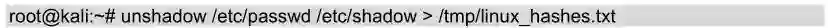 执行以上命令后,会将/etc/passwd/文件与/etc/shadow/文件结合在一起,生成一个叫做linux_hashes.txt的文件,保存在/tmp/目录中。