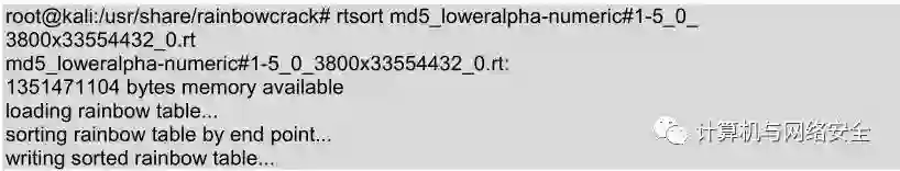 (3)为了容易使用生成的彩虹表,使用 rtsort 命令对该表进行排序。执行命令如下所示: