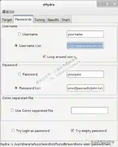 (3)在该界面指定用户名和密码列表文件。本例中使用Kali系统中存在的用户名和密码列表文件,并选择 Loop around users 选项。其中,用户名和密码文件分别保存在/usr/share/wfuzz/wordlist/fuzzdb/wordlists-user-passwd/names/nameslist.txt和/usr/share/wfuzz/wordlist/fuzzdb/wordlists-user-passwd/passwds/john.txt中。