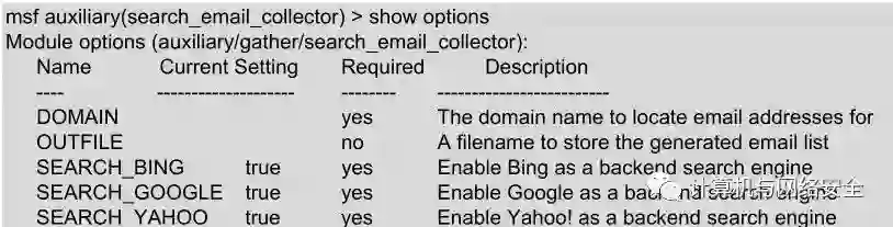 (4)查看search_email_collector模块下有效的选项。执行命令如下所示: