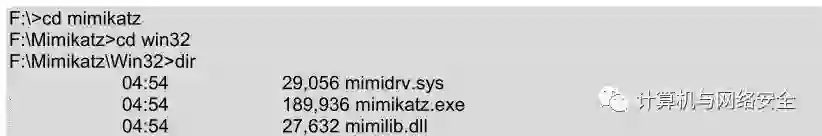 从输出的信息中,可以看到 mimikatz 目录中有三个文件。其中 Win32和 x64表示mimikatz的两个版本。根据自己的系统架构选择相应的版本,本例中的操作系统是32位,所以选择使用Win32。
