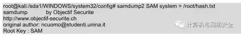 从输出信息中可以看到提取了SAM文件。将该文件的内容重定向到了/root/hash.txt文件中。