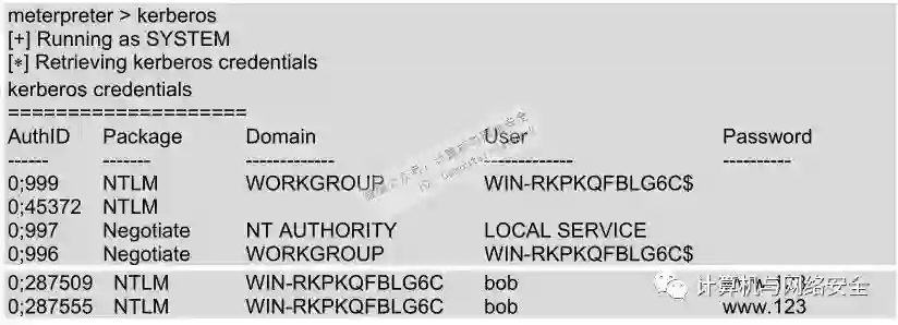 从输出的信息中可以看到,输出的信息类似msv命令输出的信息。唯一不同的就是,这里可以看到使用哈希加密的原始密码。从以上信息中,可以看到 bob 用户的密码为www.123。