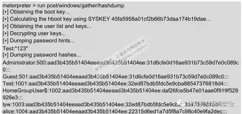 (4)查看目标主机上所有用户的哈希密码值。执行命令如下所示: