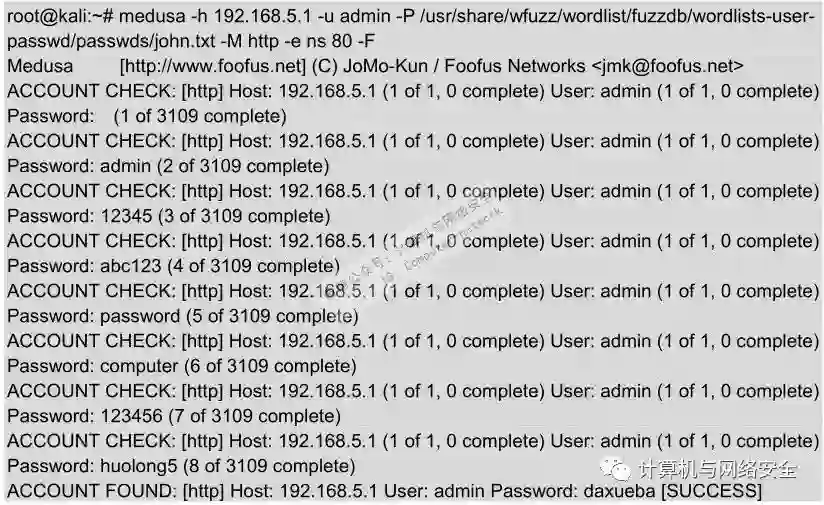 使用medusa暴力破解地址为192.168.5.1的路由器,执行命令如下所示: