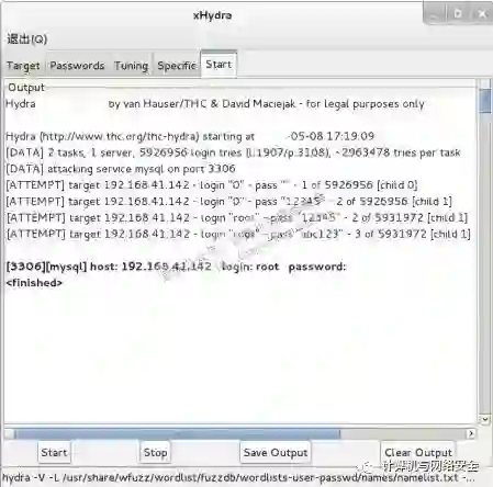 (7)在该界面显示了四个按钮,分别是启动、停止、保存输出和清除输出。这里单击Start按钮开始攻击,攻击过程如图5所示。