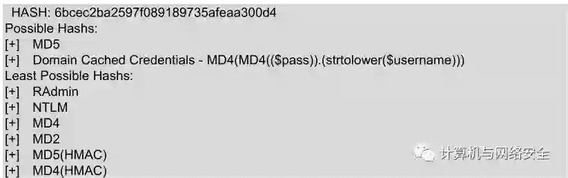 从输出的信息中,可以看到6bcec2ba2597f089189735afeaa300d4哈希值可能是使用MD5加密的。