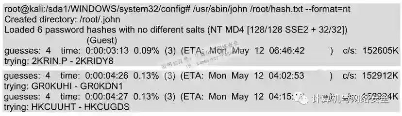 (5)运行john命令,实现密码攻击。执行命令如下所示: