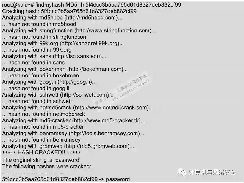 以上输出的信息是攻击LM Hashes密码的过程。经过一番的攻击,最后获取到哈希值5f4dcc3b5aa765d61d8327deb882cf99的原始密码是password。