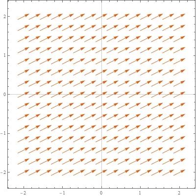 下面先来看几个向量场的图形, 绘制向量 {2,1} 的向量场图, 也就是每个地方都存在向量 (2,1).