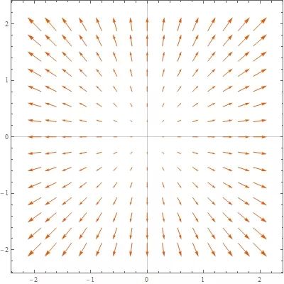 下面这个向量场中的向量同时有两个分量, 其实就是从原点呈放射状, 并且向量大小随着与原点的距离增大而增大.