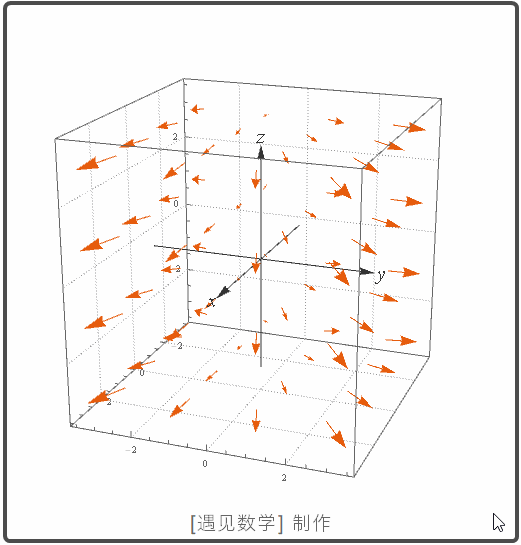 一旦我们理解平面的情况, 我们就可以来看三维的向量场图, 在空间中的每一点处都有一个向量. 每个有x,y,z三个分量表示出来, 其中每个分量都是 x,y,z 的函数.