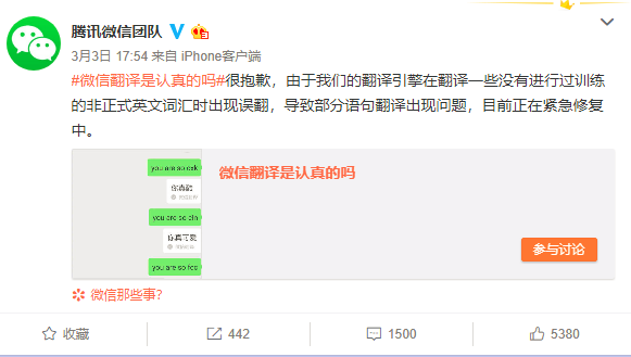 3月3日,针对微信翻译被网友曝光出现误翻问题,腾讯微信团队回应称,由于翻译引擎在翻译一些没有进行过训练的非正式英文词汇时出现误翻,导致部分语句翻译出现问题,目前正在紧急修复中。(来源:腾讯科技)