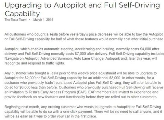 据特斯拉在其美国官网发布公告称,所有在降价前购买特斯拉的车主,可以半价购买自动驾驶仪或全自动驾驶仪,最多可以少花6000美元;从下个月开始,老车主只要花费2000美元,即可升级自动驾驶仪(原价4000美元),或者额外花费3000美元,即可获得全自动驾驶仪功能(原价7000美元)。(来源:IT之家)