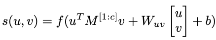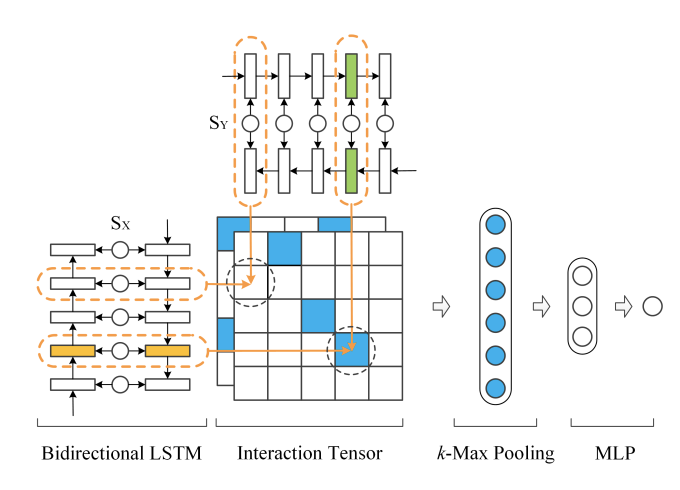 其中,u,v分别代表两个向量,Mi,i∈[1,…,c]是张量的一个切片。Wuv和b是线性变换的参数。f是非线性函数。经过张量函数变换后的结果是一个向量。然后对匹配矩阵进行K-Max的动态池化操作,也就是挑选K个最大的特征,最后采用全连接层进行维度压缩和分类。