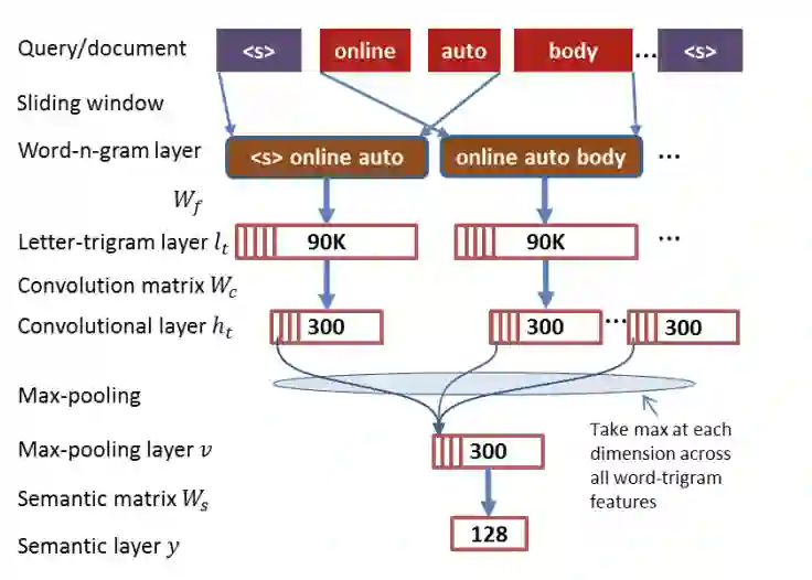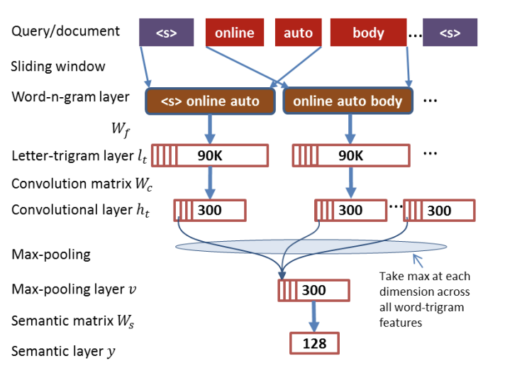 针对 DSSM 词袋模型丢失上下文信息的缺点,CDSSM(convolutional latent semantic model)2014年由微软提出,又叫 CLSM。CNN-DSSM 与 DSSM 的区别主要在于输入层和表示层, 与DSSM相比,该算法相比原始DSSM将近会有10%的效果提升。原文传送门https://www.microsoft.com/en-us/research/wp-content/uploads/2016/02/cikm2014_cdssm_final.pdf