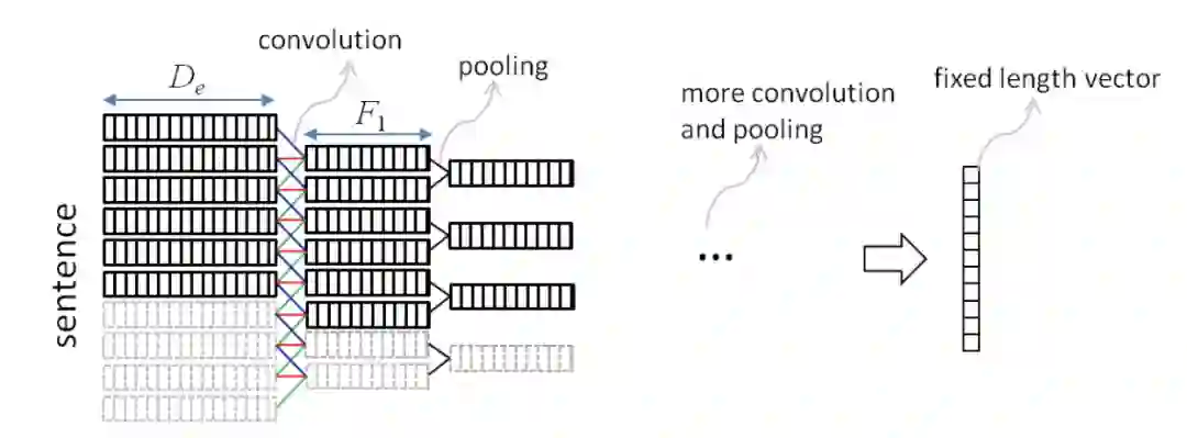 本文基于CNN为句子建模,对于长度较短的句子作补0处理,卷积的计算和传统的CNN卷积计算无异,可参考上文的CDSSM。卷积的作用是从句子中提取出局部的语义组合信息,pooling的作用是对多种语义组合进行选择,找出置信度高的特征组合。