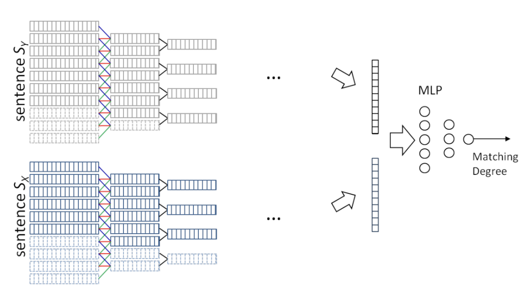 从图中可以看出,两个句子分别进行特征提取,得到两个相同且固定长度的向量,向量为句子经过建模后抽象得来的特征信息,然后将这两个向量作为一个多层感知机(MLP)的输入,最后计算匹配的分数。