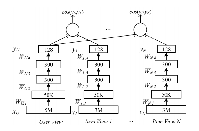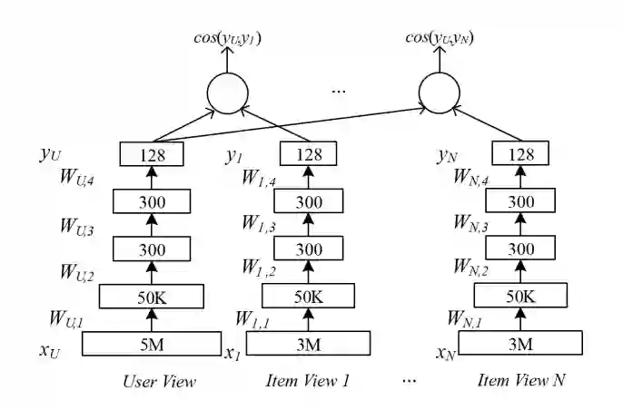 MV为Multi-View,一般可以理解为多视角的DSSM,原文传送门https://www.microsoft.com/en-us/research/wp-content/uploads/2016/02/frp1159-songA.pdf,该文章2016年由微软发表,并将其用于用户推荐。这个工作同样是对DSSM的改进,与CDSSM和LSTM-DSSM不同的是,它没有改变网络结构,而是从信息源入手解决这个问题。