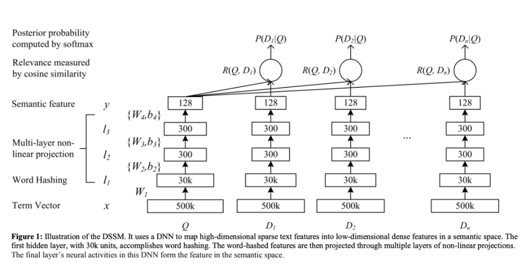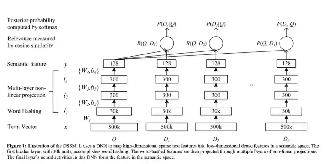 DSSM的全称是Deep Structured Semantic Models,是匹配模型的鼻祖。原文传送门:https://www.microsoft.com/en-us/research/wp-content/uploads/2016/02/cikm2013_DSSM_fullversion.pdf,这篇paper2013年由微软Redmond研究院发表,短小但是精炼。下图为DSSM的整体网络结构