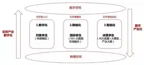 元宇宙能够赋能产业数字化、网络化、智能化转型。包括:设计、生产、运输、交付等产业链各环节,其应用遍布制造、建筑、汽车、物流、城市、能源等实体产业。第一步是产业链数字化:对生产线或产品进行传感捕捉,形成孪生商品或工厂模型。第二步是产业链网络化:通过5G或物联网,将生产线环境与产品数据实时上传到AI超算中心上,生产大数据在线融合,形成“指标孪生”。第三步则是产业链智能化:基于生产数据训练出自动化或半自动化决策模型,沉淀知识图谱和产业大脑,通过机器人或机器手反向指挥生产参数调整,形成“决策孪生”的价值闭环。