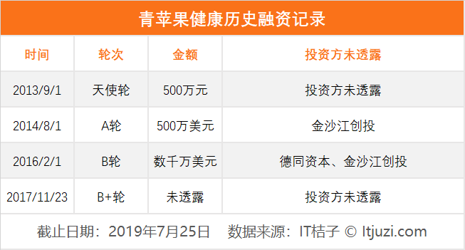 IT 桔子数据显示,「青苹果健康」曾获得 4 轮融资,累计融资金额超过 2 亿元(经计算后得出),投资方包括金沙江创投。