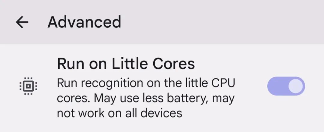 相对较新款的手机中,SoC 一般都会使用「大小核」设计,即使用性能更高的大核心去处理复杂任务,使用性能更低的小核心去处理简单任务。用户可以限制 AMM 仅使用小核心进行音频识别,这样能够降低 AMM 的耗电量,尤其是你设置了更短的时间间隔。我们可以在高级设置中找到这一开关,当然这也不一定适用于所有手机,我们可以观察开启前后的耗电量差异来判断该选项是否有效。