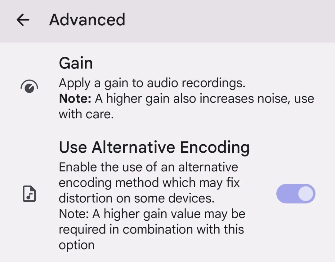 :借助 AMM 提供的回放功能,我们可以确认「闻曲知音」能否正常录制音频。正常情况下,回放的音频至少是能够听出个大概;如果声音太小,那么就需要在高级设置中拉升「Gain」即音频增益;如果你听到的是一堆杂音,那么需要在高级设置中启用「Alternative Encoding」,根据开发者的描述,该选项会导致音频声音变小,所以还需要配合拉升增益。