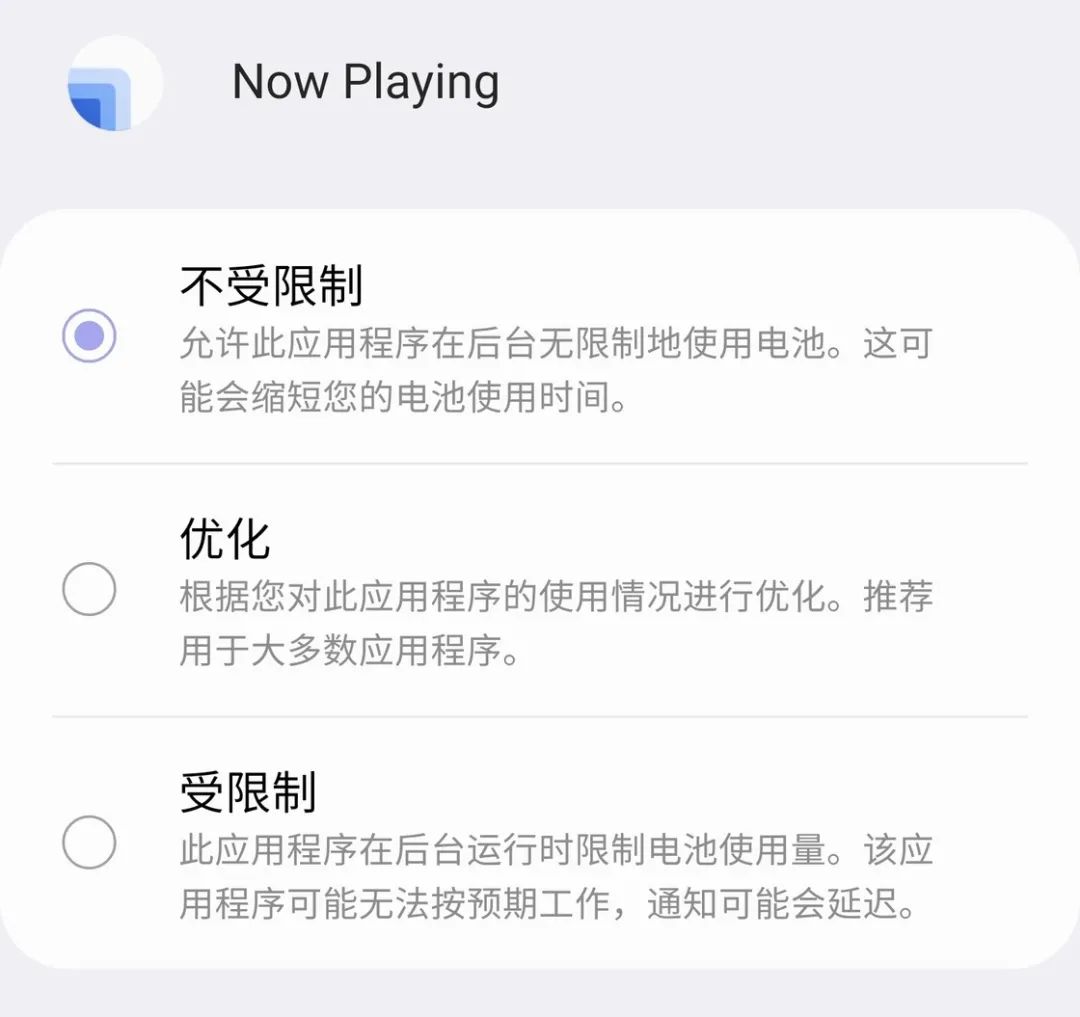 :我们在第一次使用 AMM 时一切正常,但过一段时间发现 AMM 不会在后台进行识别了,此时我们第一反应是通过手动识别进行测试;如果手动识别时应用多次提示录制失败,或者是卡在录制启动的 Loading 画面,我们就要去检查 App 的应用权限和后台电池优化选项是否正常,别忘了还有一个「闻曲知音」,因为它才是真正执行音频识别任务的那个主角。