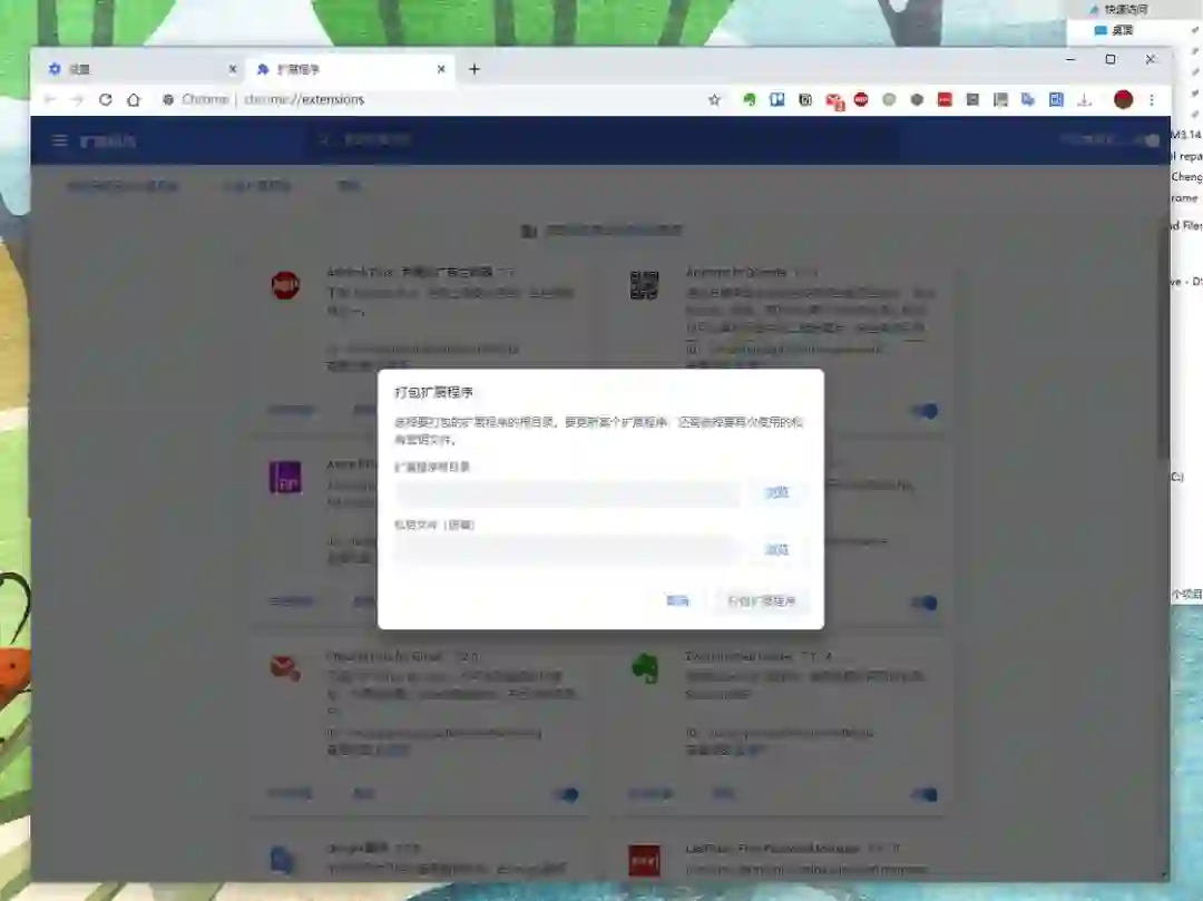 确认勾选并启用「开发者模式」后,回到「扩展程序」管理页面(chrome://extensions/)并点击工具栏中的「打包扩展程序」,选择已经解压好的扩展文件路径,在弹出的窗口中无需添加私钥文件并选择「打包扩展程序」。