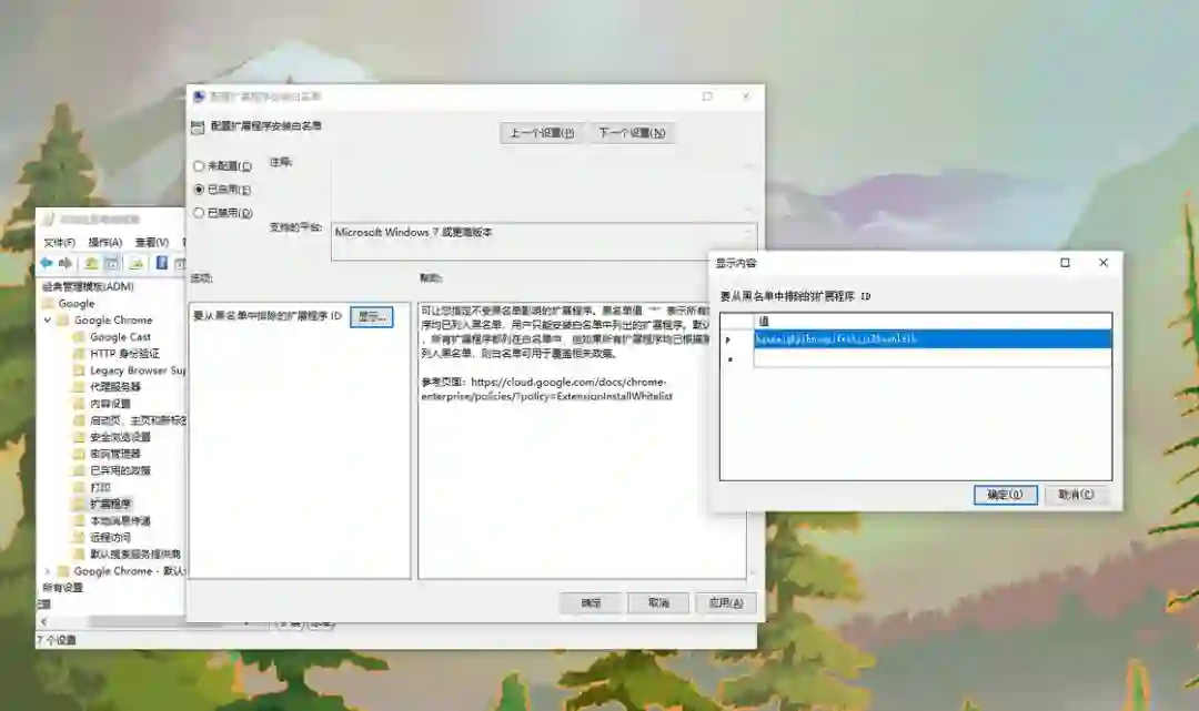 在控制项中选择「已启用」,然后在「排除的扩展程序 ID」中点击显示,将刚才拷贝扩展 ID 添加上去并确定保存。