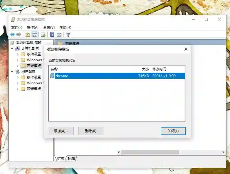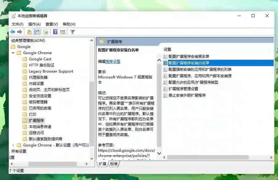 ,然后点击关闭,这时候在组策略管理的左侧会出现「经典管理模版」;依次展开「Google > Google Chrome > 扩展程序」,在右侧找到「配置扩展程序安装白名单」,双击打开。