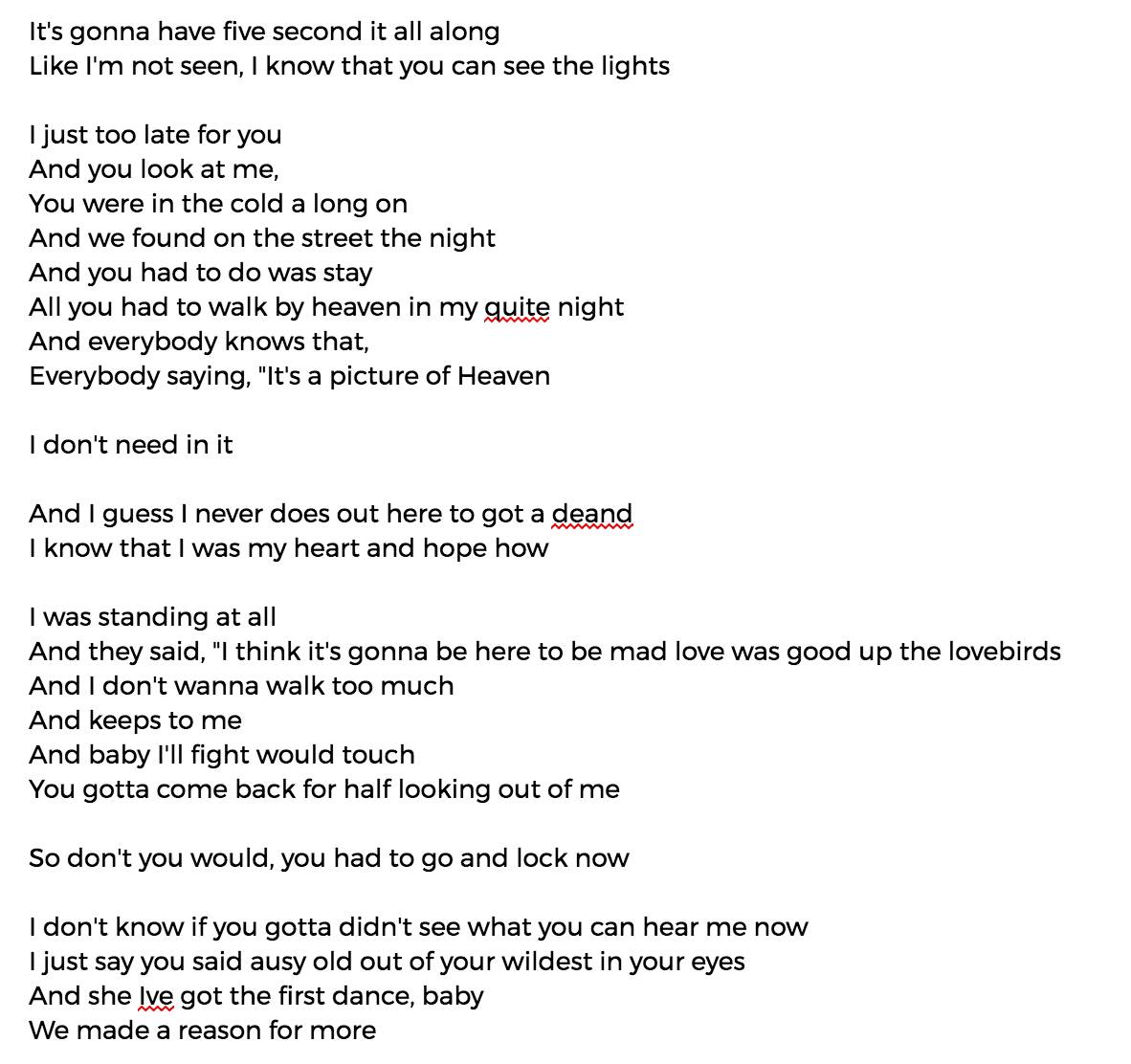 上周,我想看看机器学习(ML)能否拯救一下霉霉的歌?我将霉霉所有歌的歌词输入到一个循环神经网络(RNN)中,并采样了一些新歌词。以下就是我得到的结果(一点也没改,直接从复制粘贴的):