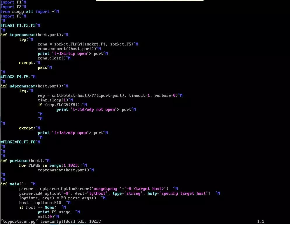 进入攻击机虚拟机操作系统Ubantu Linux32bit中的root目录,完善该目录下的tcpportscant.py文件,对目标HTTP服务器应用程序工作传输协议,端口号进行扫描判断,填写该文件当中空缺的FLAG1字符串,将该字符串作为FLAG值。