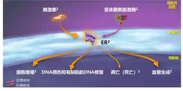 雌激素对于乳腺组织正常生长和发育必不可少。但是雌激素高表达却是乳腺癌的主要风险因素之一。其中的一个机制是它可以通过诱导DNA损伤导致乳腺癌的发生。雌激素通过调节关键效应蛋白包括ATM,ATR,CHK1,BRCA1和p53以及这些蛋白反馈的雌激素受体信号通路改变DNA损伤反应(DDR)和DNA修复。而激素受体阳性乳腺中DDR和DNA修复蛋白经常会发生突变或者异常,从而诱导DNA损伤,抑制DNA修复和凋亡,促进增殖。