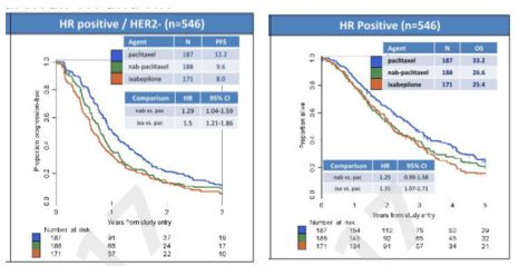 而对于激素受体阳性的患者,紫杉醇治疗的中位PFS为12.4个月,伊沙匹隆和白蛋白紫杉醇治疗组的PFS均劣于紫杉醇组,分别为8.0个月(HR,1.62;95% CI,1.29 to 2.04;P=0.001)和10.0个月,(HR,1.45; 95% CI,1.16 to 1.81;P=0.0012)。