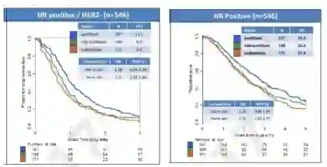 在中位随访5.5年之后,三组的中位OS时间分别为:紫杉醇组27.1个月,白蛋白紫杉醇组24.2个月,伊沙匹隆组23.6个月。有趣的是,作者在多因素模型中发现,激素受体状态是紫杉醇 vs. 白蛋白结合性紫杉醇疗效的影响因子,交互检验p值有显著性差异。