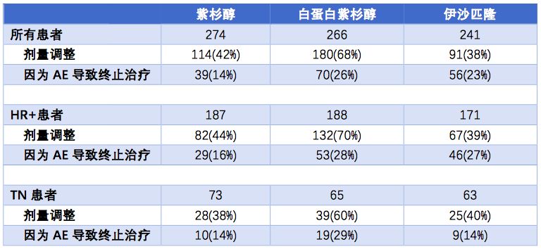 由于不良事件而导致的终止治疗和剂量调整,白蛋白紫杉醇组的发生率明显高于紫杉醇和伊沙匹隆组。