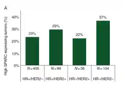 同样,SPARC的表达以及它和白蛋白之间的相互作用可能也是影响白蛋白紫杉醇疗效的分子标记之一。在新辅助GeparTrio研究中发现,SPARC表达与HR状态和乳腺癌分子亚型密切相关。与激素受体阳性(HR+/HER2- 23%)和HER2阳性亚型(HR+/HER2+ 29%;HR−/HER2+ 22%)相比,SPARC在三阴性乳腺癌中表达更高(37%)4。因此激素受体阳性乳腺癌因SPARC表达水平低,也是可能影响白蛋白紫杉醇转运继而影响其疗效的原因之一。